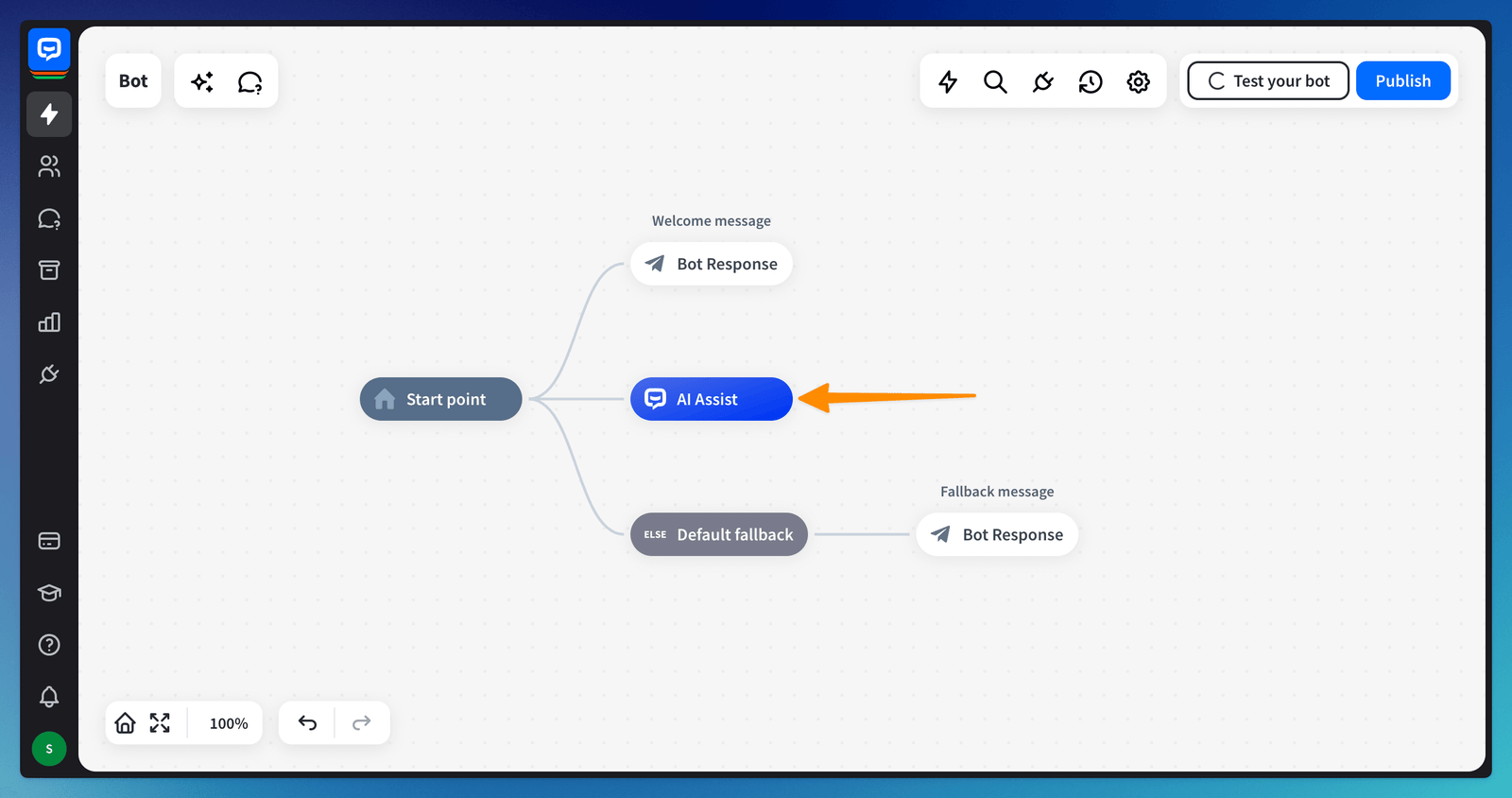 Your ChatBot AI Assist block is next to the Start Point. Although you can’t edit it, when you see it in your bot, you can be sure the AI is enabled.