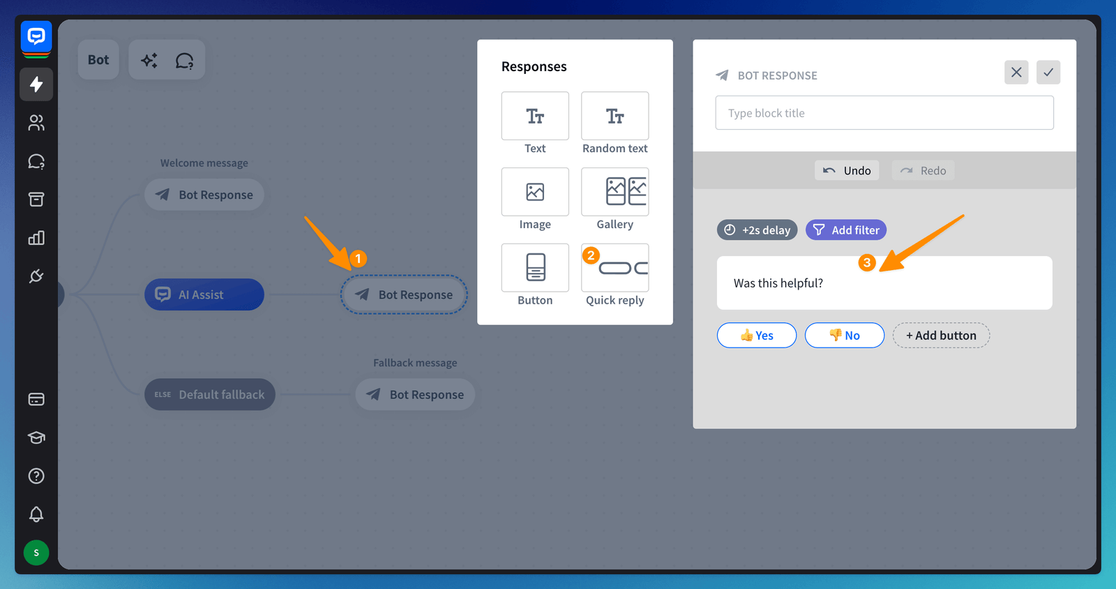 Add a Bot response block after the AI Assist block. Edit the newly added action. We used the Quick Reply bot response to ask the user if the answer was helpful.
