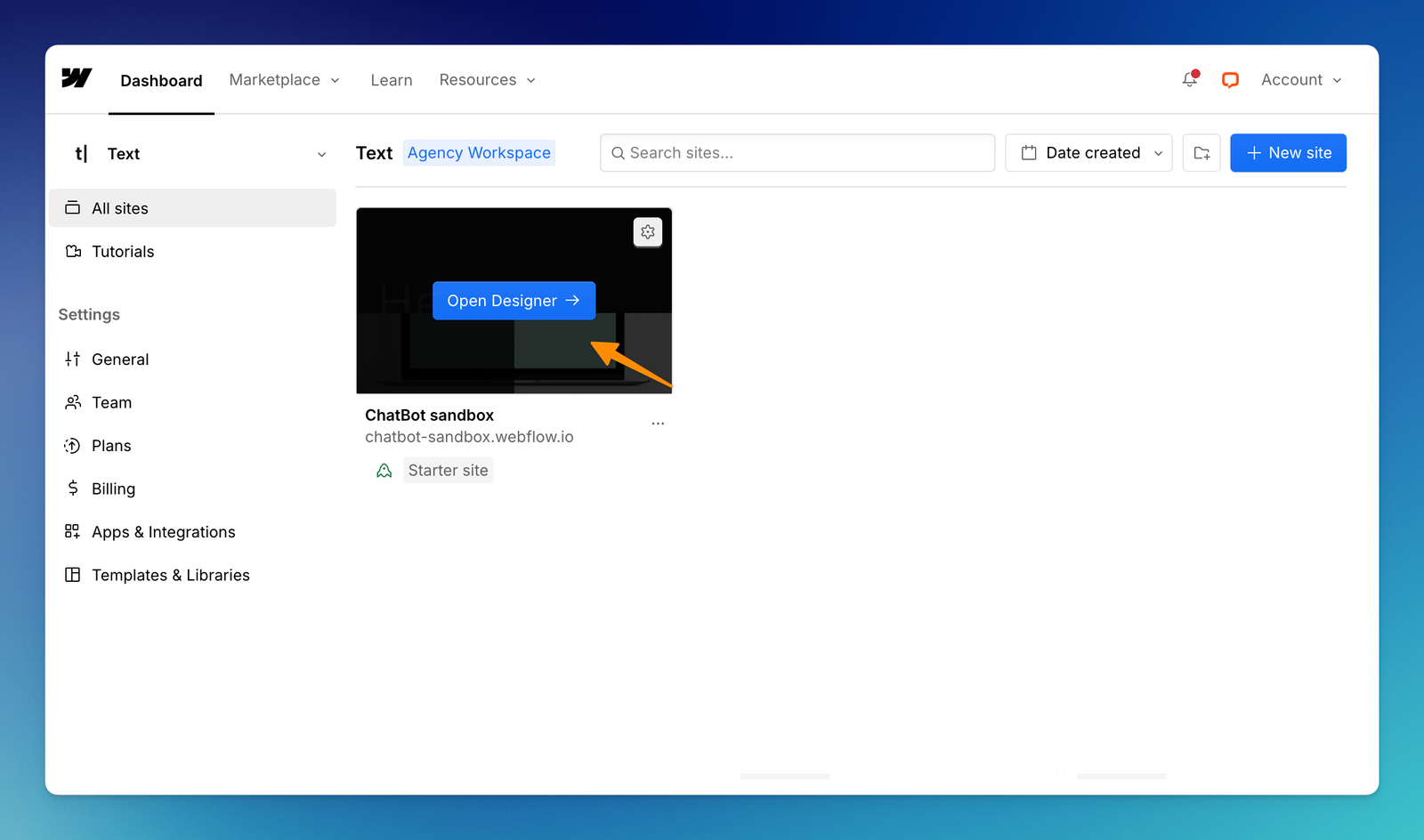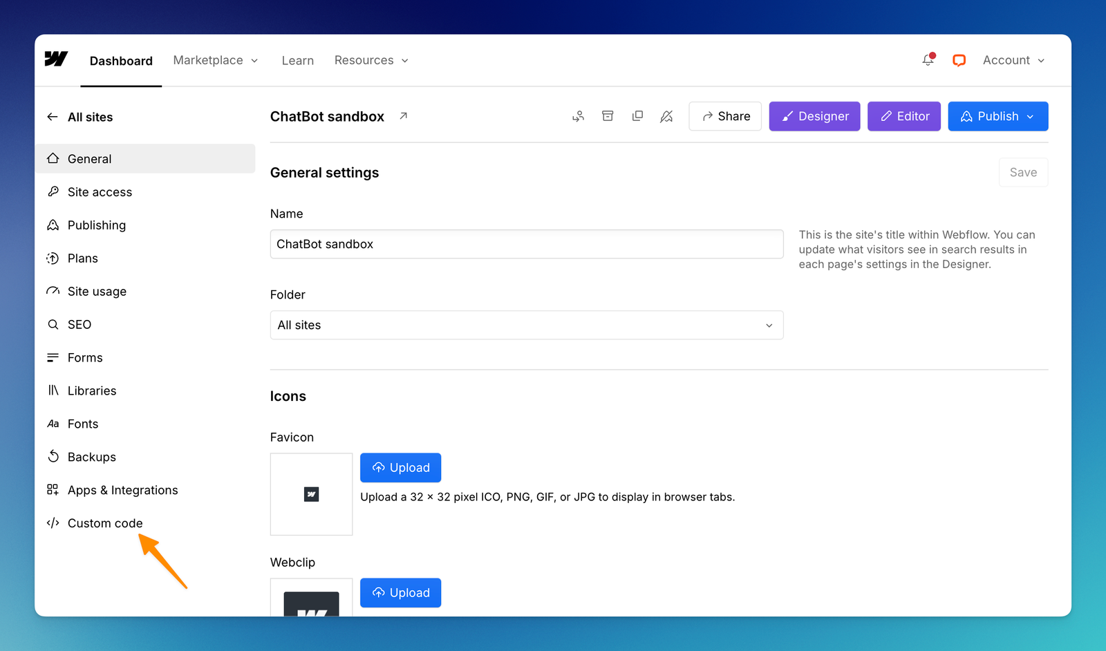 Log in to your Webflow account and select View dashboard. Select the page on which you want to add a bot.