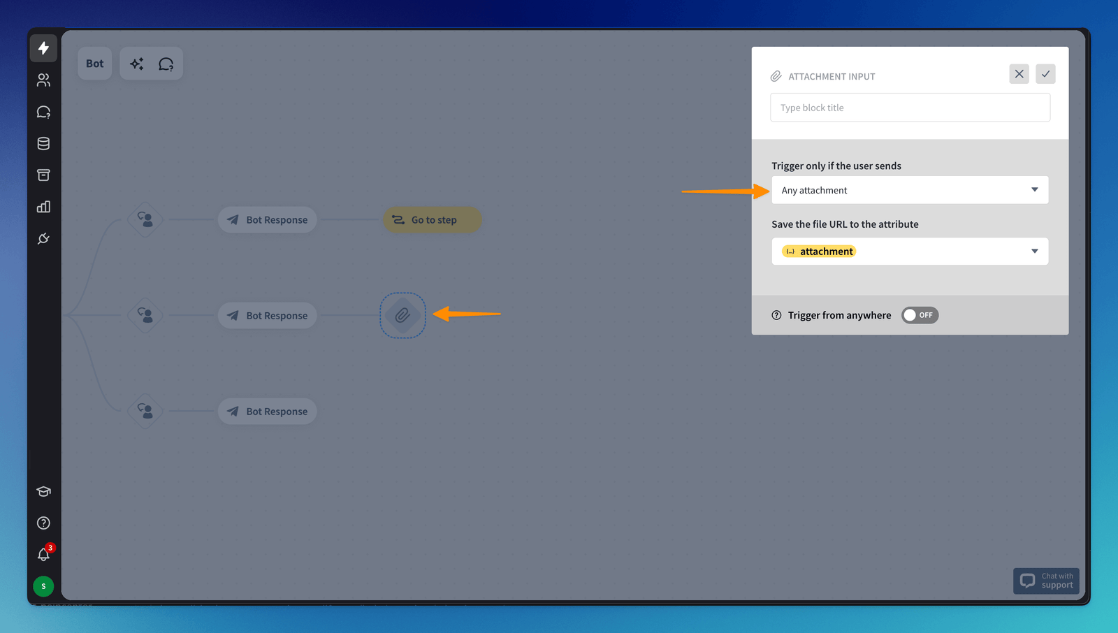 Open your bot and drag the Attachment input block to where you want the user to provide a file in the bot flow. Select the type of attachment to trigger a subsequent chatbot response.