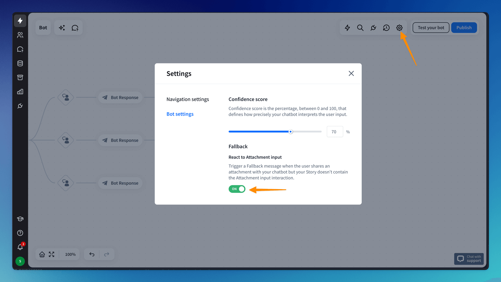 To display a Fallback message when the user tries to share a file but your bot flow doesn’t do that, go to Bot Settings and turn the React to attachment input option on.