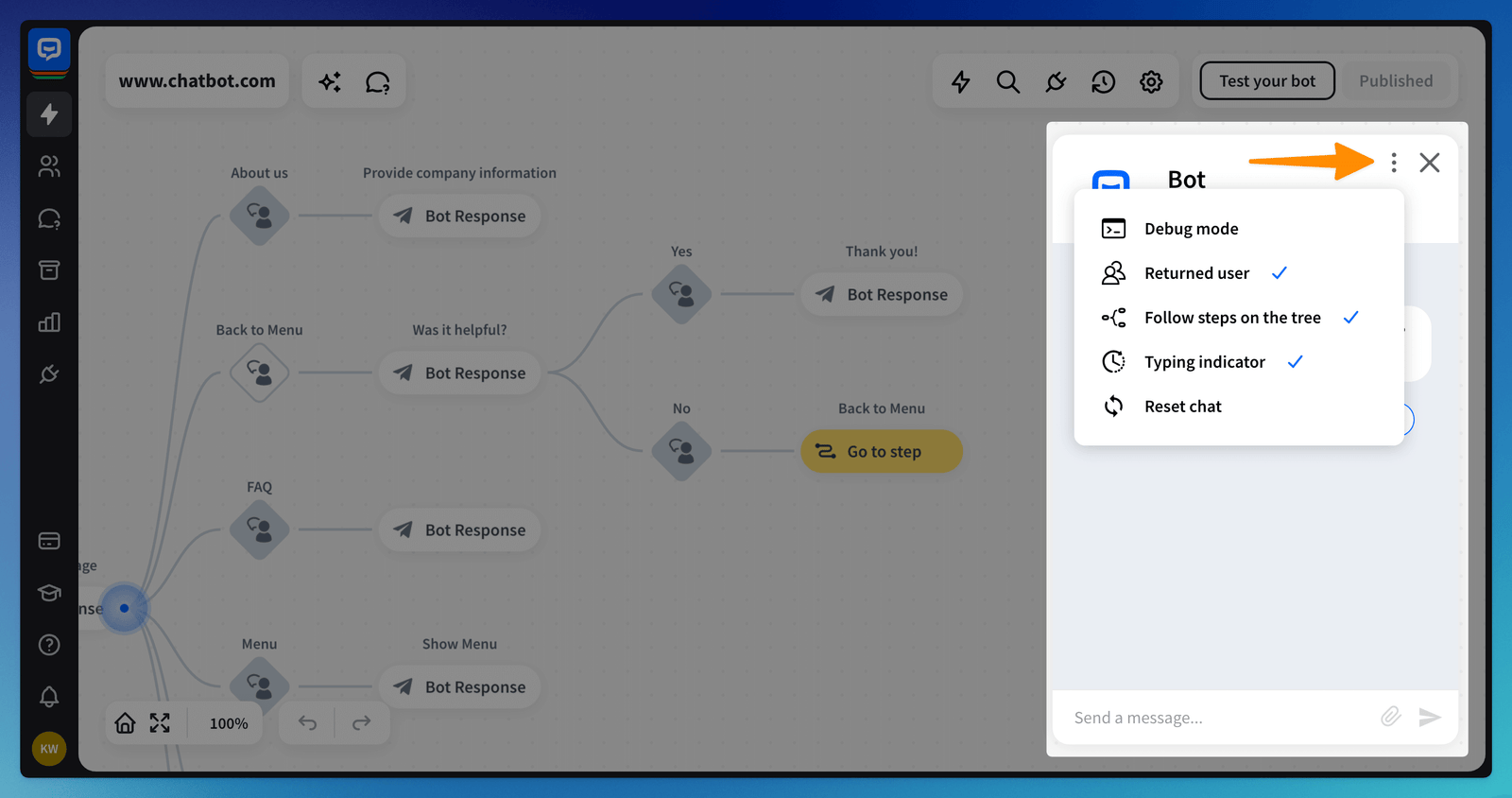 • Debug Mode - see all the actions and interactions triggered during the chat, not only messages sent.