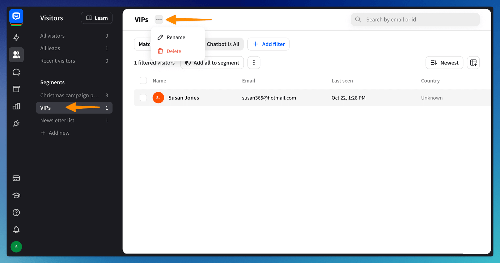 ChatBot automatically collects all visitors who chat with it and stores their data in the Visitors section. Depending on your needs, you can add or delete visitors from Segments at any point in that section. You can also design the bot flow to send different messages for visitors added to segments.