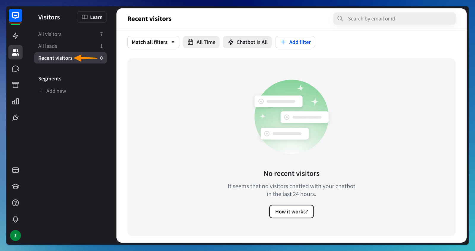 This section shows all visitors who chatted with your bot in the last 24 hours. When the last time they reached out to the bot was longer than that, they will be removed from this section. You can then find them in the All visitors section.
