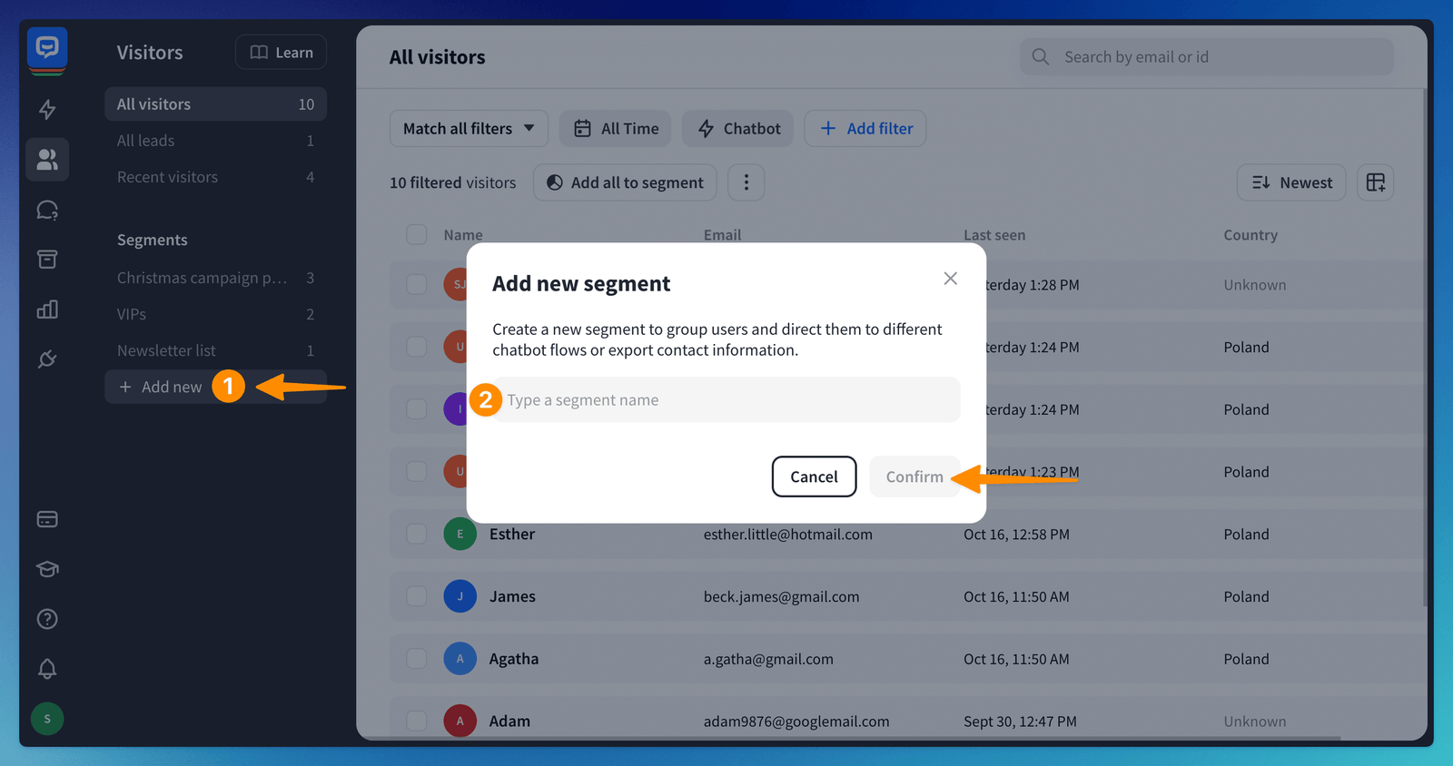 You can filter the visitors (1) based on time, bot name, and the collected information saved as default attributes during the chat. In this view, you can also add visitors to segments (2).