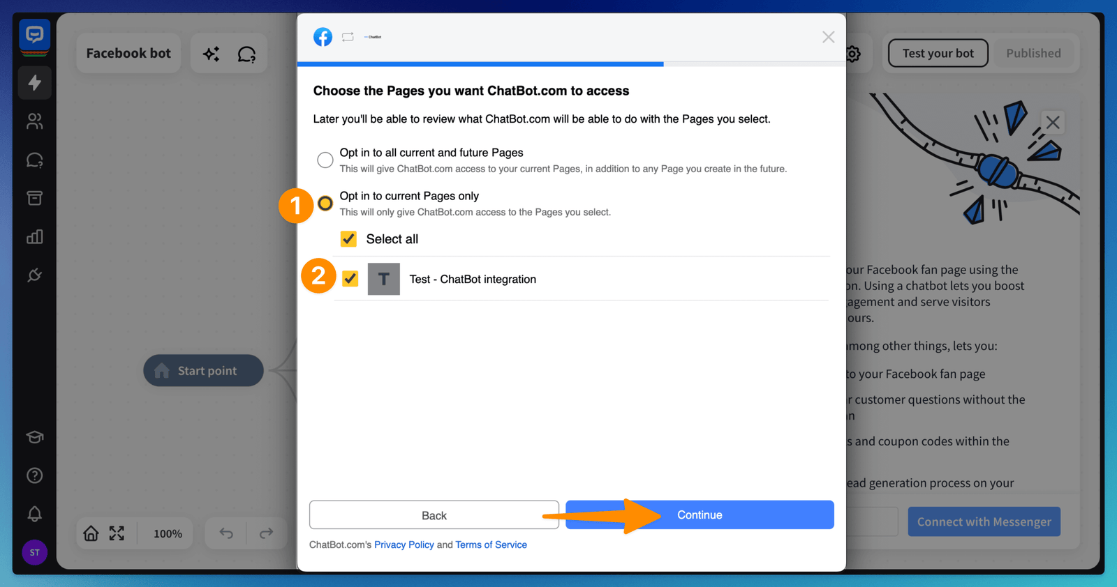 Continue with your logged-in account. Choose the Opt in to current Pages only option (1) and select the page from the list (2). Continue.