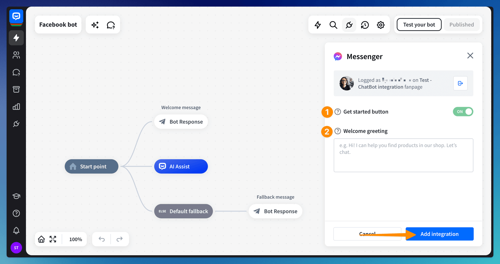 Decide whether to turn the Get started button on or off. Add a Welcome greeting that will show in the Messenger window. Click the Add integration button.