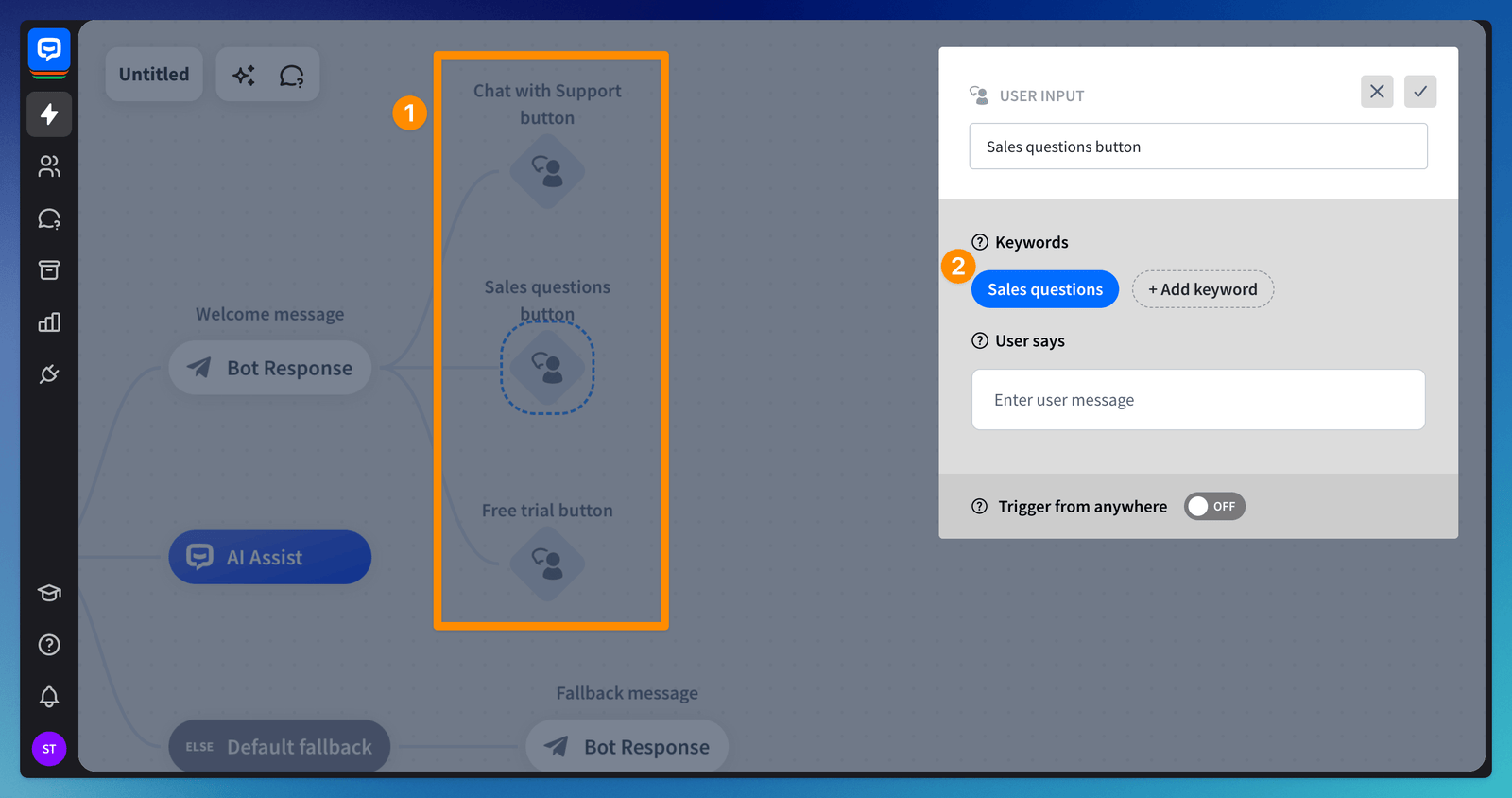 Add User input blocks to the bot (1). In each block, add the phrase from the button (2).