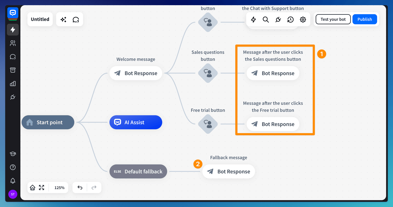 If you do not put the buttons’ titles inside the bot flow, the bot will trigger the Fallback message (2) because it will not recognize the phrase.