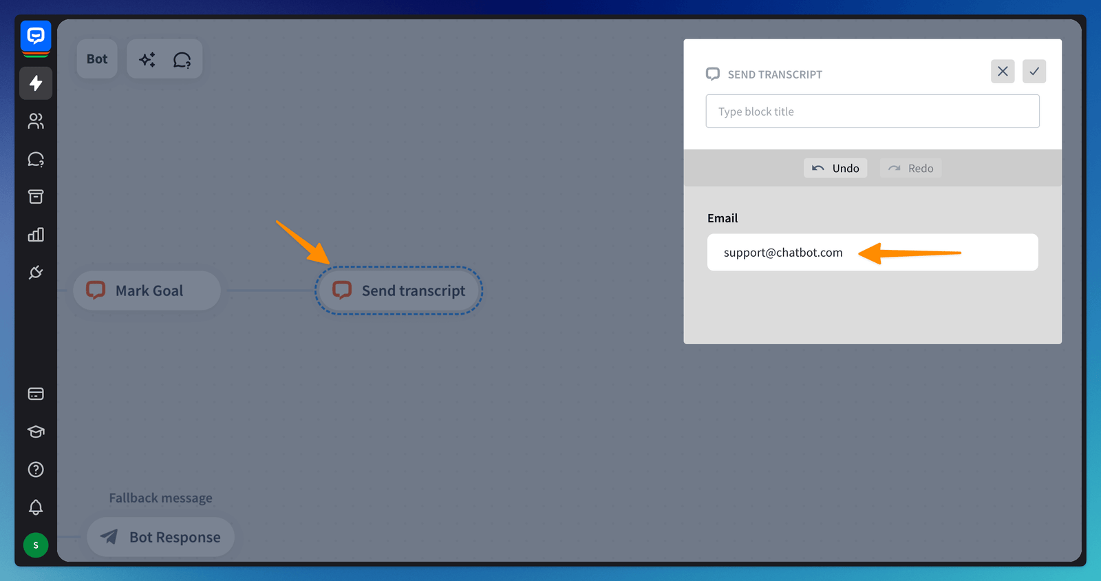 The transcript action allows you to set a point of the bot flow that will automatically send you an email with the full transcript of the conversation.