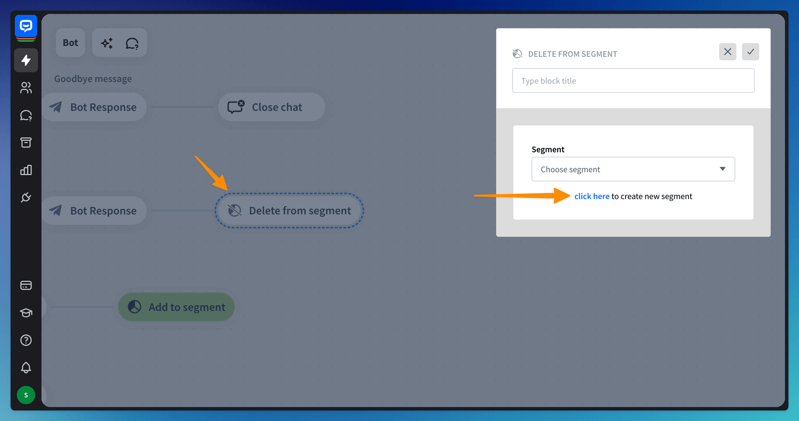 You can use actions directly on the bot flow to manage your segments - you can automatically add and delete visitors from segments with dedicated actions - Add to segment and Delete from segment. The visitor will be added or deleted from the list when the block is triggered during the chat.