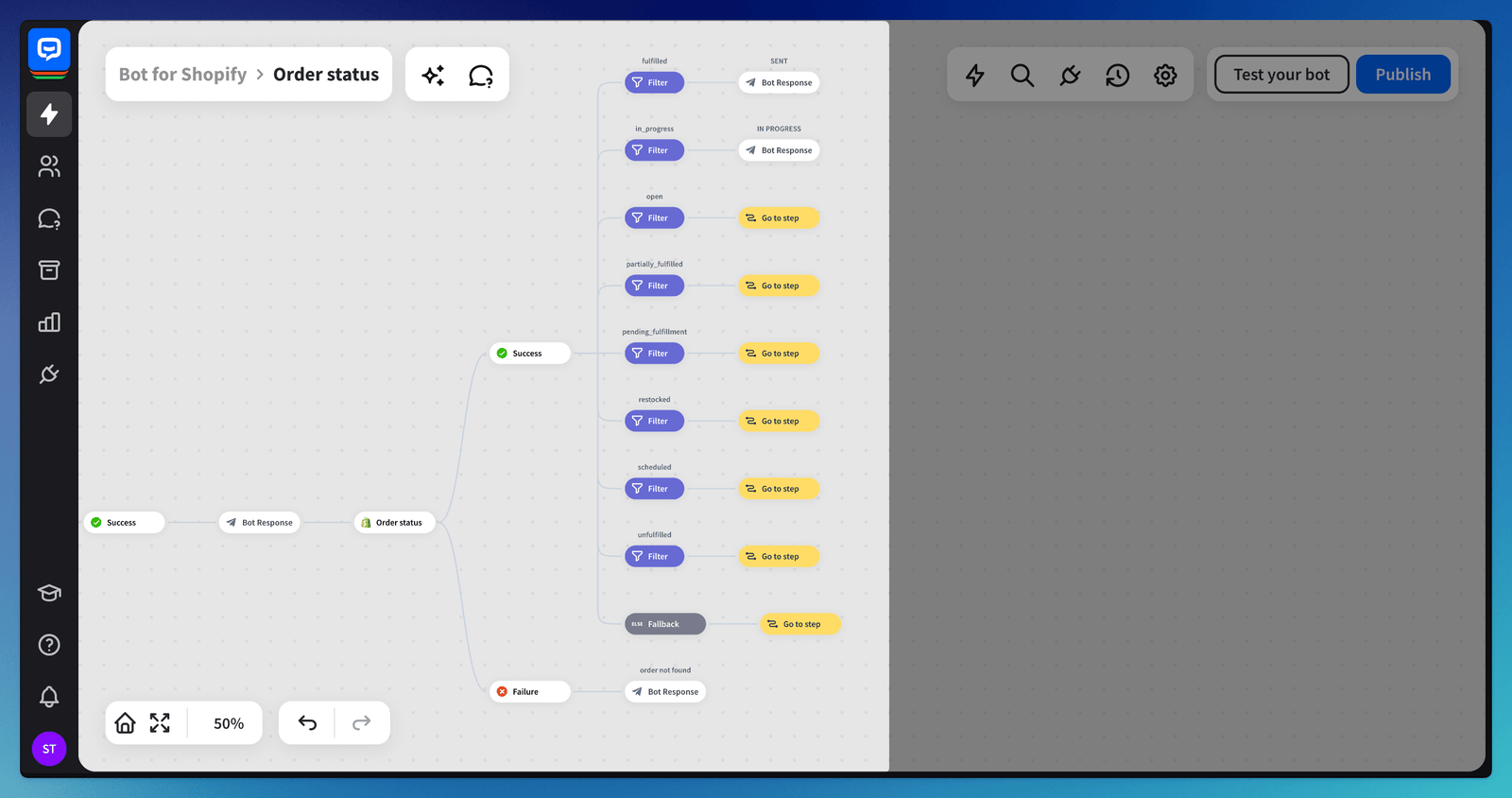 You can also create such a flow from scratch. You can see the step-by-step instructions in this article. When creating the flow from scratch, remember to check all available statuses in your Shopify store and place them on the bot structure.