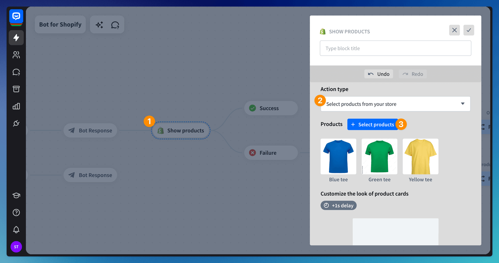 To show your products in the chat, log into your store first. Then, drag the Show products action to the bot flow (1) and open the block. In the Action type section, select the Show products from your store (2) option. This option will display the products you choose. To select products, click the Select products button (3).