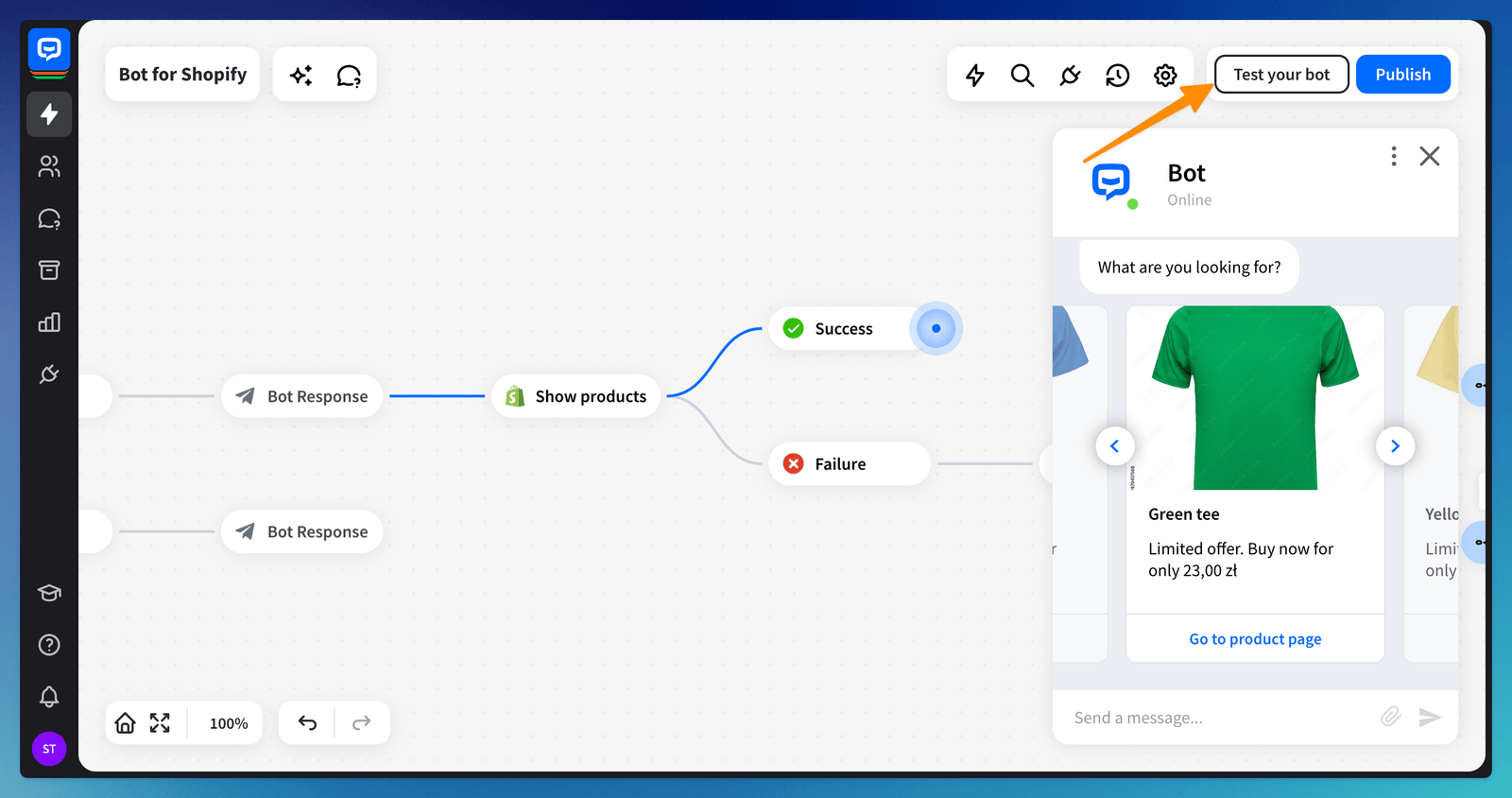 Test your bot to check whether your cards are displayed properly. The items will be available as cards in the chat. When the user selects the card button, they’ll be taken to the corresponding product page in your Shopify store.