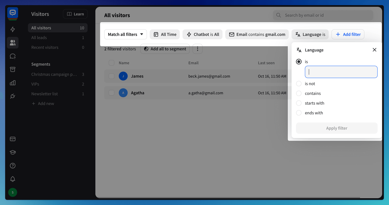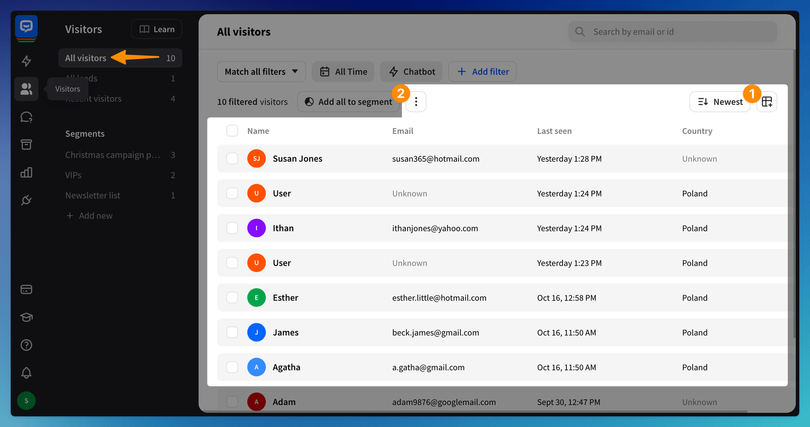 You can filter the visitors (1) based on time, bot name, and the collected information saved as default attributes during the chat. In this view, you can also add visitors to segments (2).