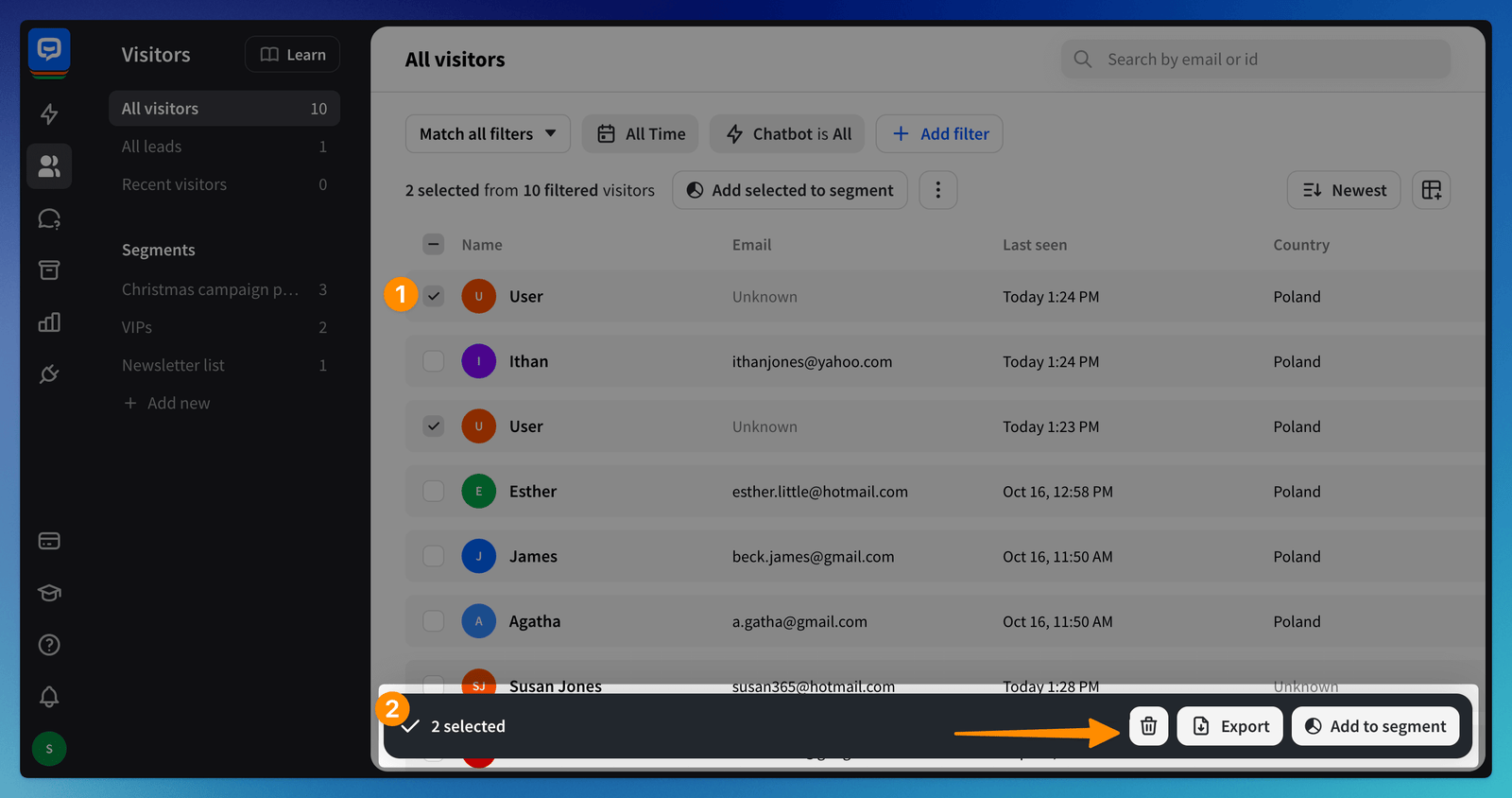 You can select multiple visitors from the list and perform one of the available actions in bulk — export all the visitor data to a single .csv file, add visitors to Segments, or delete them.