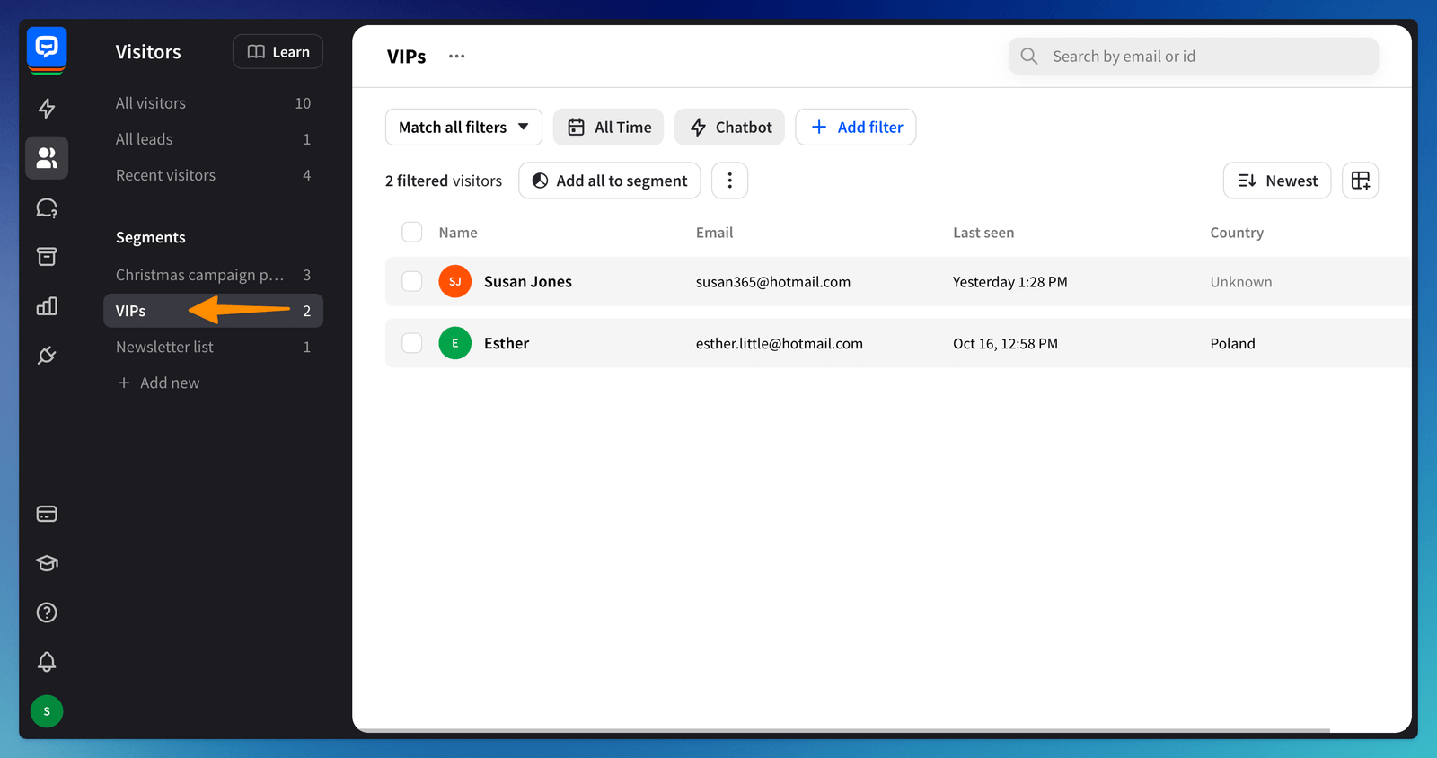 You can create a segment to collect people who want to join your newsletter, VIP visitors, returning visitors, and more. Depending on your needs, you can add or delete visitors from Segments at any point in this section.